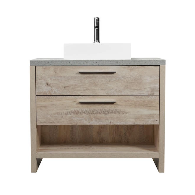 Install this Luxo Marbre vanity and refresh your bathroom with a countryside flair. Engineered marble makes this sink durable to ensure lasting use. Its smooth surface is easy to clean as its seamless form avoids dirt and bacteria buildup. A basic faucet (not included) fits in a pre-drilled hole. An overflow leads excess water directly to the drain before it spills over the sink. The vessel vanity sink has useable space on either side. With two drawers and an open shelf, the vanity has room for all your toiletries. Sleek chrome drawer pulls and a wood finish come together in the country style of this bathroom vanity with a marble top. The melamine veneer keeps its form, even with excessive heat and moisture. This model measures 36 in W x 22 in D x 30 in H.