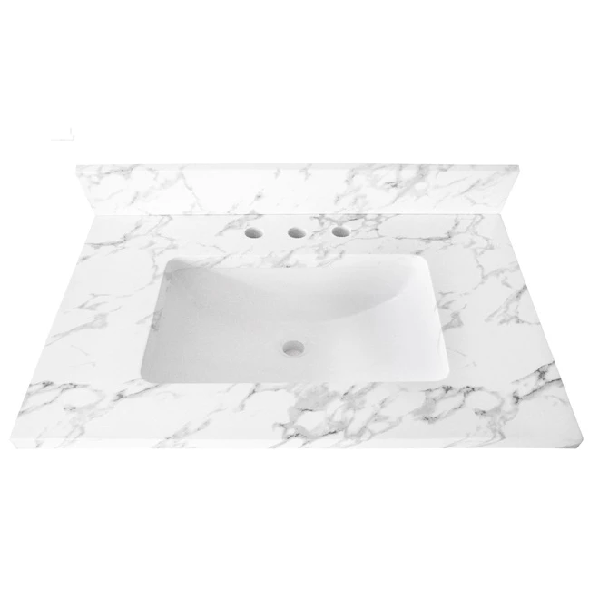 Give your bathroom some character with this beautiful synthetic marble vanity top. Its durable construction is made to resist everyday use and is easy to clean. The 7-inch-deep rectangular basin is very practical, while the integrated 4-inch backsplash prevents water infiltration between the wall and vanity. Comes with a 1-year limited warranty, faucet and drain sold separately.