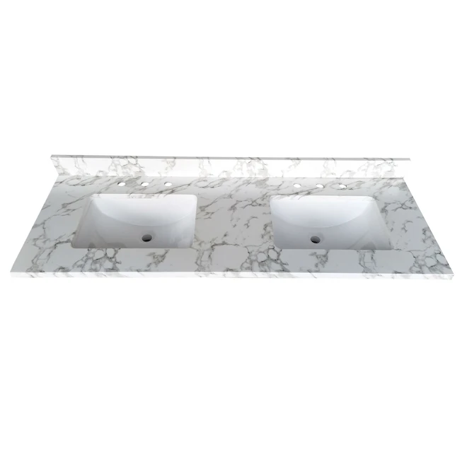 Give your bathroom some character with this beautiful synthetic marble double vanity top. Its durable construction is made to resist everyday use and is easy to clean. The 7-inch-deep rectangular basins are very practical, while the integrated 4-inch backsplash prevents water infiltration between the wall and vanity. Comes with a 1-year limited warranty, faucets and drains sold separately.