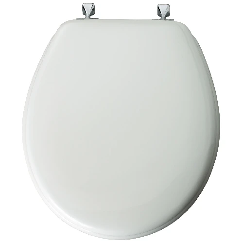 Give your bathroom a stunning look with this Mayfair molded wood toilet seat. It comes with long-lasting, stylish chrome metal hinges which complement the bathroom hardware. Made of enameled wood with a high-gloss finish, this regular toilet seat resists chips and scratches. STA-TITE seat fastening system ensures the seat stays firmly attached to the toilet. This soft white toilet seat fits most manufacturers’ round toilets and enhances bathroom decor. Made using eco-friendly materials and processes, this wood toilet seat is easy to install. Colour-matched bumpers and dial-on hinges make it a visual charm. Made in the USA, this adult size toilet seat measures 14.37 in W x 16.56 in L x 2.06 in H. This seat comes with a 1-year limited warranty.