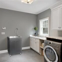 This utility sink and storage cabinet by Presenza is designed to transform the style and function of your laundry room, workshop, or garage. A single lever handle faucet makes it easy to adjust the water temperature and pressure with one hand. A pull down faucet sprayer head is especially handy in filling pails or washing difficult to clean items.