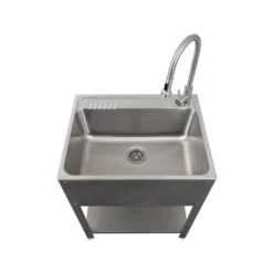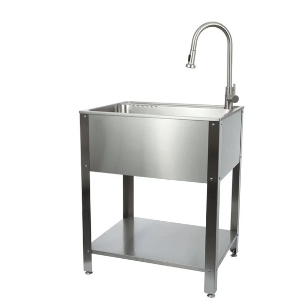 Presenza offers a unique line of premium grade stainless steel sinks. This elegant utility sink station is designed to transform the style and function of your laundry room, workshop, or garage. It features a deep stainless steel sink that can handle just about all domestic cleaning tasks and makes an excellent pet wash station. The farmhouse-style stainless steel stand with an integrated shelf provides a convenient space for storing and organizing your cleaning supplies. The single lever handle faucet makes it easy to adjust the water temperature and pressure with one hand. The pull down faucet sprayer head is especially handy in filling pails or washing difficult to clean items. With Presenza you get outstanding quality for good value.
