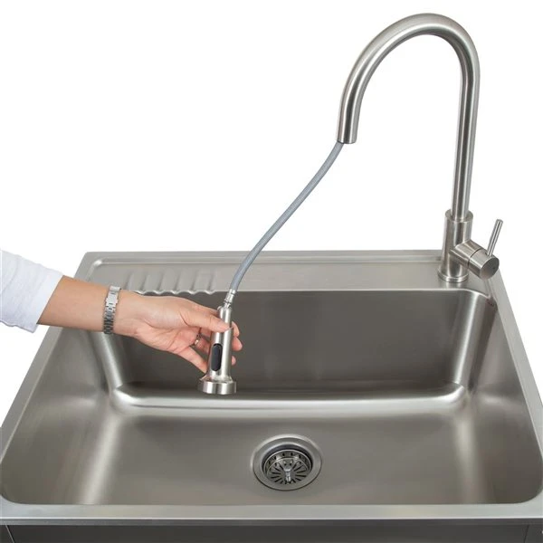 - Includes: Farmhouse style sink stand, utility sink with 3.5″ strainer and pull-down faucet with garden hose adapter