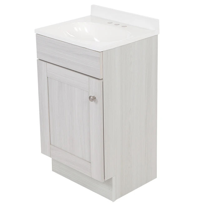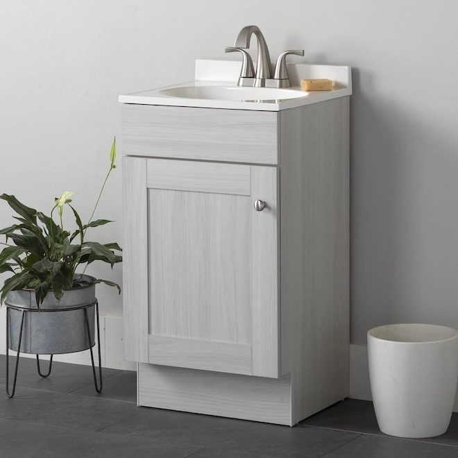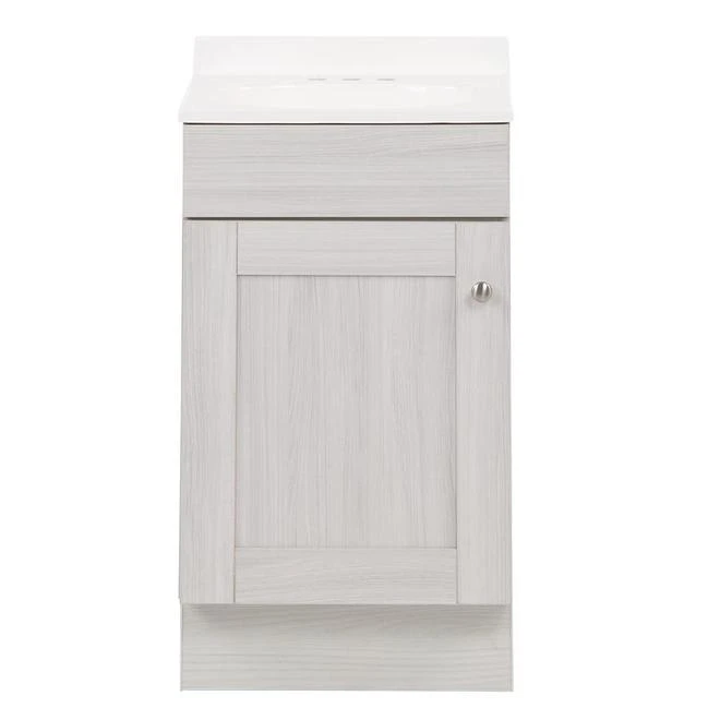 Bathroom vanity with shaker style with white texture finish. Dimension of 18-in W x 16-in D included white cultured marble countertop with a single bowl. Pre-drilled for easy installation of a 4-in minispread faucet (faucet sold separately). A single door and easily adjust the doors with 6 way adjustable hinges. Fully assembled and ready to be installed