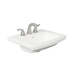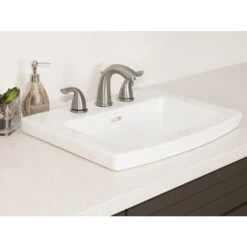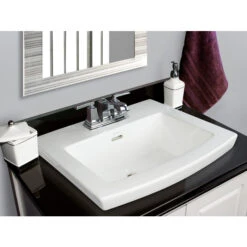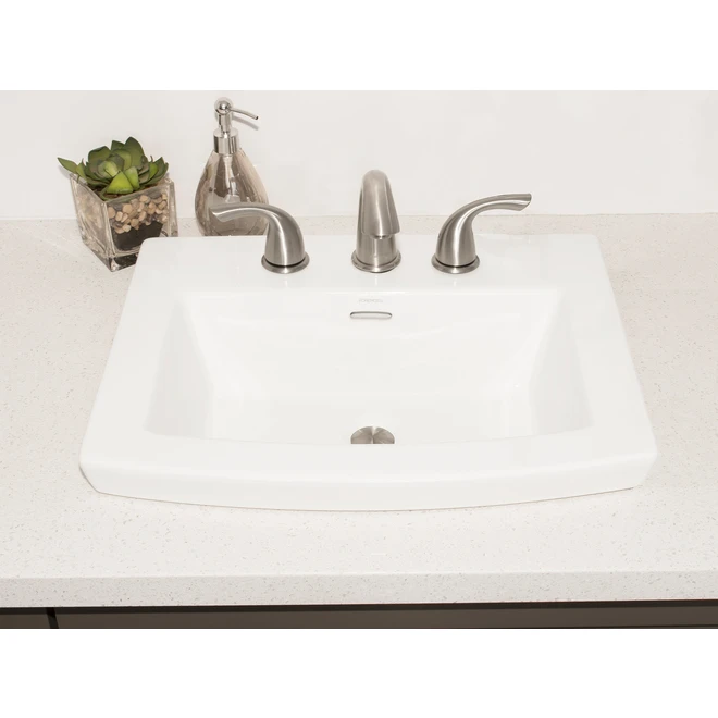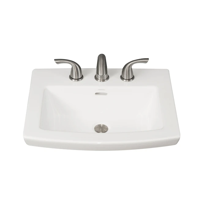 The Project Source Cavallie drop-in bathroom sink features a rectangular shape and three pre-drilled holes to accommodate a 4-in faucet. Made of durable white porcelain, it is easy to clean and its high quality finish will not fade. The faucet is sold separately.