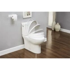 This home essential toilet seat features a quiet-close lid. It closes slowly and quietly without slamming. Color-matched plastic hinges for a coherent look. Fits most manufacturers round toilets.