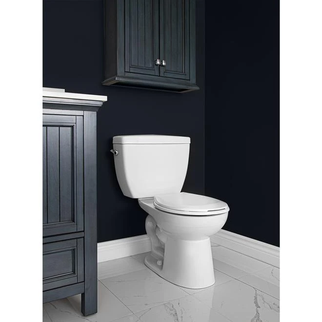This Project Source Minuet 2-piece toilet features a round, standard height bowl and a chrome lever located on the side of the tank. This low consumption model uses 6 litres of water per flush and has a flushing capacity of 1000 g. It has a 10-inch rough-in and is made of sturdy vitreous china that’s designed to retain its clean appearance for decades. Everything you need to install it is included: seat, wax ring, and floor bolts. This model is backed by a 5-year limited warranty.