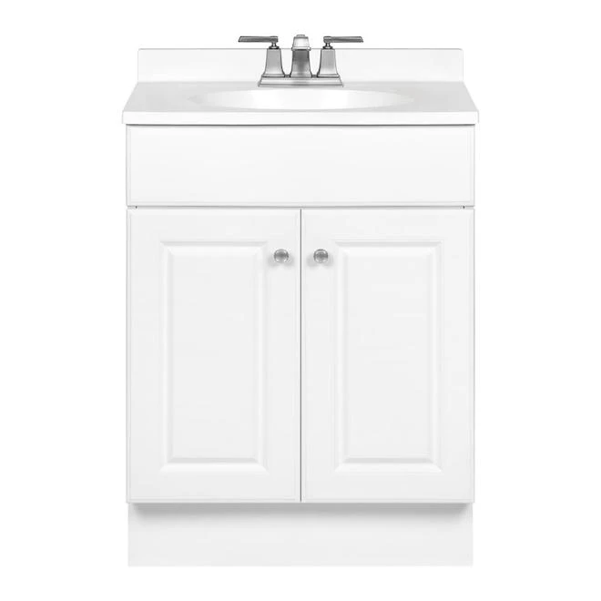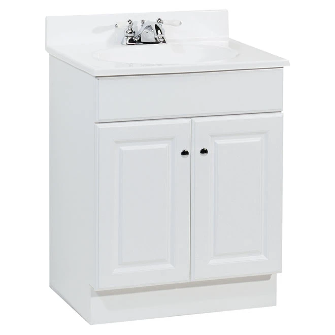 The Richmond vanity with a cultured marble sink by RSI Home Products gives your bathroom a soft and traditional style. This fully assembled vanity is made of MDF with a clean white finish and features a 2-door cabinet in which you can store towels and other bathroom accessories. There is a 4-inch pre-drilled faucet mount and hardware for easy installation. Faucet sold separately.