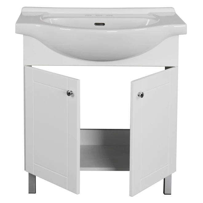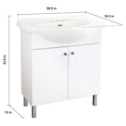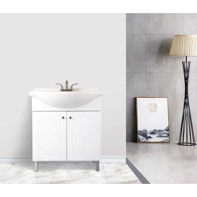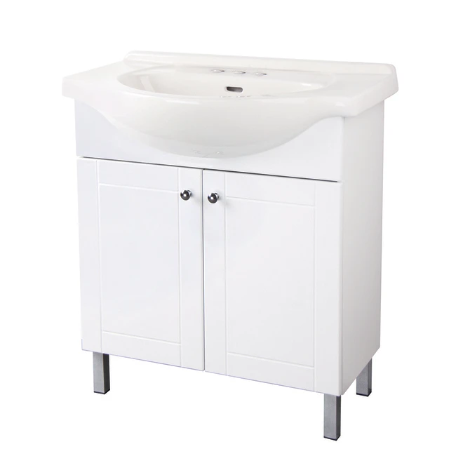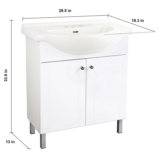 This elevated vanity with sink is ideal to fit in small to medium-sized bathrooms. Its Euro ceramic sink, white cabinet and chromed legs will add a modern touch to your bathroom. It features two soft closing doors and chromed knobs. Preassembled, this vanity measures 30 in x 34 in x 19 in.