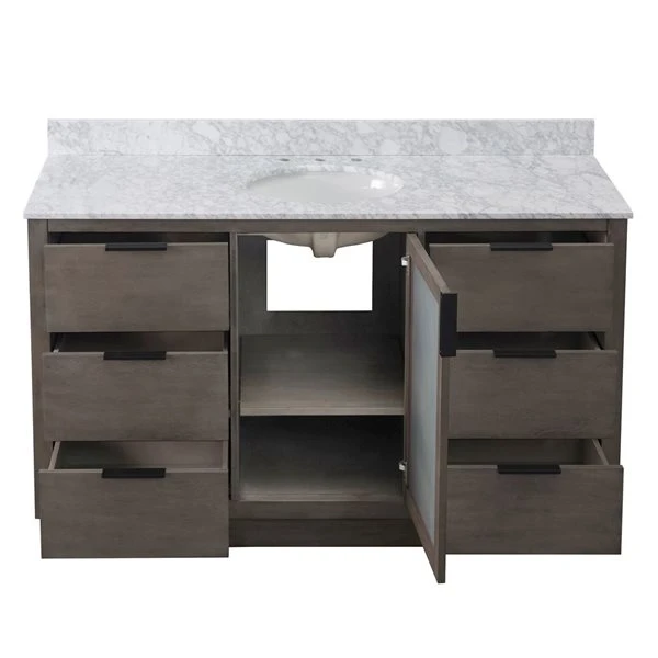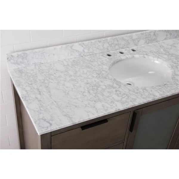 Update your bathroom into a clean and modern space with this 60-in single sink vanity constructed with a solid wood frame covered in a water-resistant finish that will keep it looking new after years of use. The vanity includes an Italian white Carrara marble countertop predrilled for a standard widespread faucet and backsplash. The translucent cabinet door and flat-front drawers complement today’s modern home. The black pulls provide function and maintain simplicity. An oval white porcelain undermount sink is included. Six functional drawers and a large single-door cabinet all with soft-close hinges or slides keep bathroom essentials organized and out of sight. Plumbing fixtures sold separately.