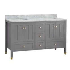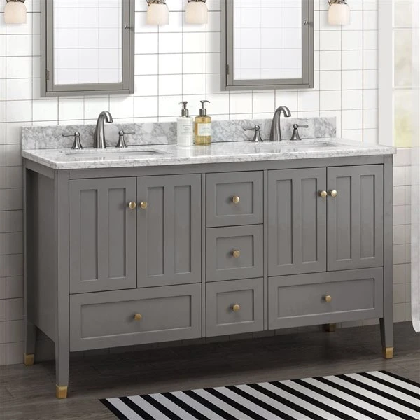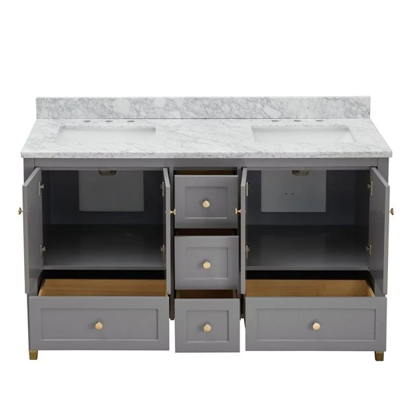 Transform your bathroom into a clean and modern space with this 60-in double sink vanity constructed with a solid wood frame covered in a water-resistant finish that will keep it looking new after years of use. The vanity includes an Italian white Carrara marble countertop predrilled for standard widespread faucets and backsplash. The Shaker-style cabinets and drawers complement today’s modern farmhouse and many more aesthetics. The gold pulls and feet caps add a pop of updated class to the simple design. Two undermount rectangular white porcelain sinks are included. Five functional drawers and two cabinets with double doors all with soft-close hinges or slides keep bathroom essentials organized.