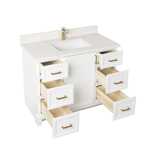 Painted white vanity for a clean look and neutral canvas, making décor and design options endless. Six dovetail drawers are soft-closing with full extension hardware for extra strength. One centred, full height door for flexible storage. The painted white is primed, painted, and sanded between coats followed by a final light clear coat to offer a satin-like finish. Pearl Quartz countertop with classic white undermount sink by akwa. Pearl Quartz is powder white that brings softness to any vanity. No sealing is required, making it maintenance free. The Classic sink is a traditional style, distinguished by a deep, elongated basin. Offered with a single hole drill pattern.