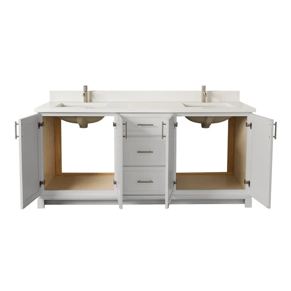 Dove Grey is one of the most transitional Premium Painted colours that adds a stylish touch to a durable vanity. Three central dovetail drawers are soft-closing with full extension hardware for extra strength. Four cabinet, full-height doors for flexible storage. The Premium Painted products are primed, painted, and sanded between coats followed by a final light clear coat to offer a satin-like finish. Pearl Quartz countertop with two classic white undermount sinks by akwa. Pearl Quartz is powder white that brings softness to any vanity. No sealing is required, making it maintenance free. The Classic sink is a traditional style, distinguished by a deep, elongated basin. Offered with a single hole drill pattern.